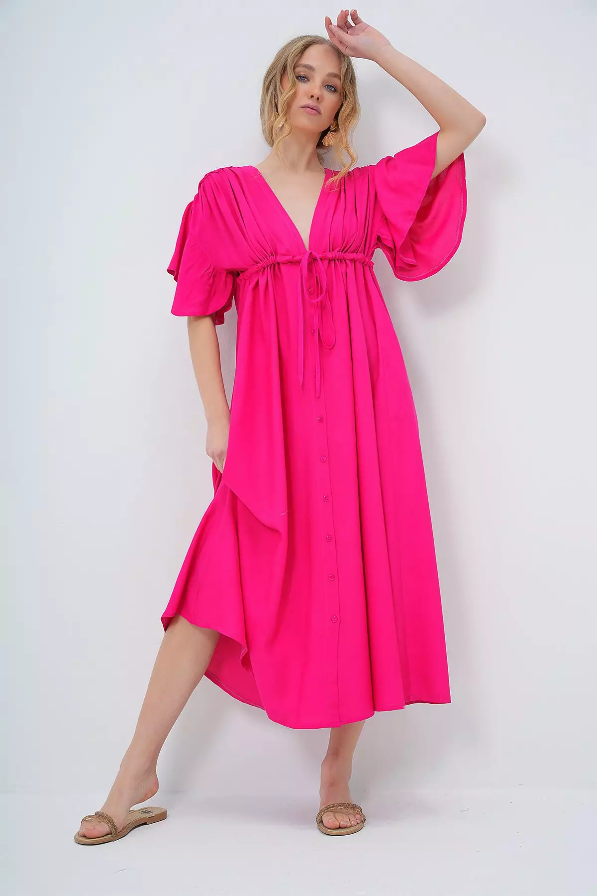 AlacatiWomen's Fuchsia V Neck Backless Tie Detail Front Buttoned Summer Poplin Dress55.90