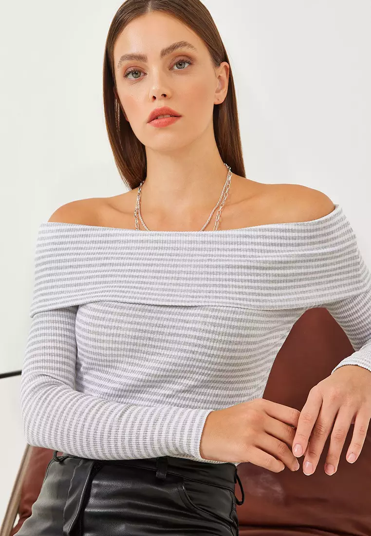 Bianco LucciWomen's Madonna Collar Striped Ribbed Long Sleeve Blouse 6025188915.90