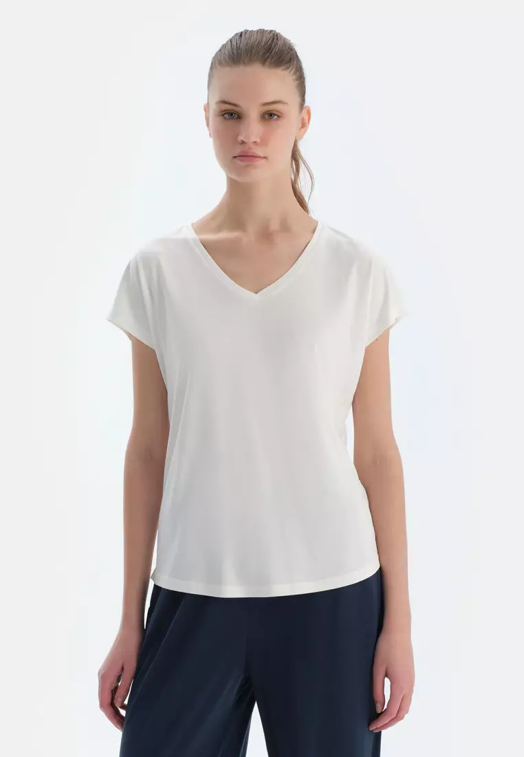 DAGİOff White Basic T-Shirt, V-Neck, Regular, Short Sleeve Loungewear for Women87.0039.00