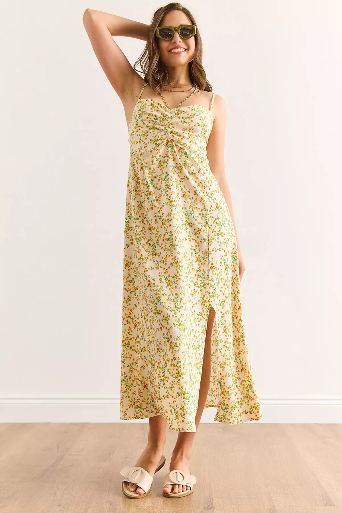 Women's Ecru Orange Strap Adjustable Front Gathered Woven Viscose Dress Elb-19002438